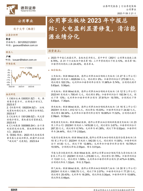 【德邦证券】【20230921】公用事业行业板块2023年中报总结:火电盈利显著修复,清洁能源业绩分化-29页 行业研究