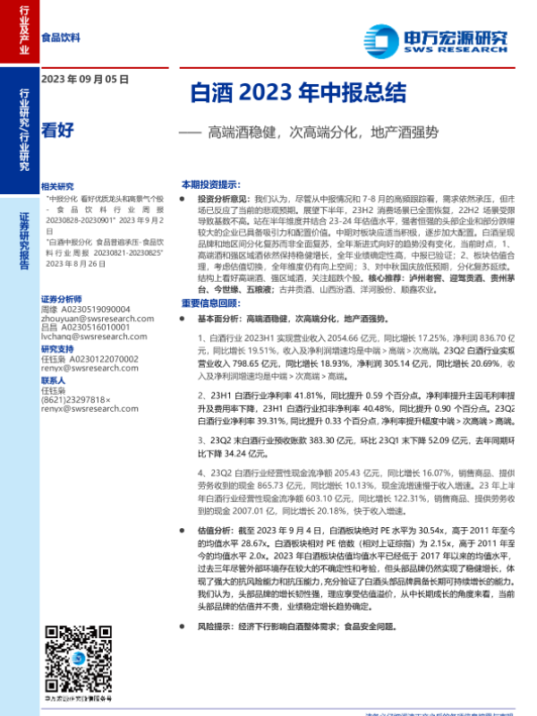 【申万宏源】【20230905】食品饮料行业白酒2023年中报总结:高端酒稳健,次高端分化,地产酒强势-15页 行业研究