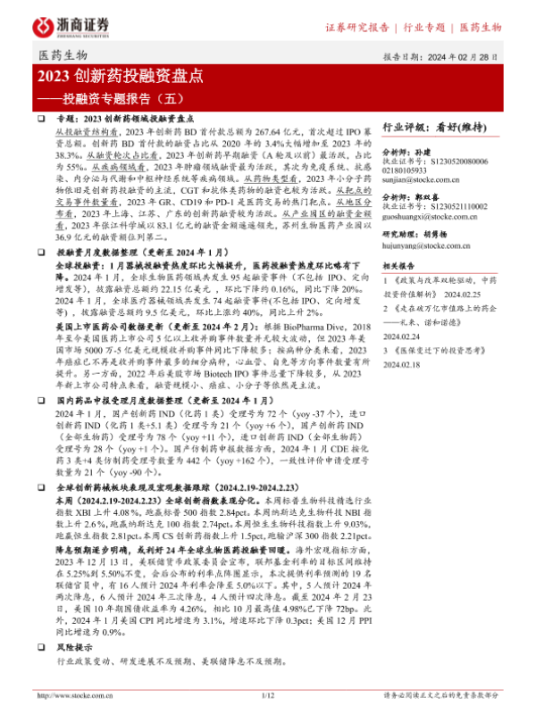 【浙商证券】【20240228】医药生物投融资专题报告(五):2023创新药投融资盘点-12页 行业研究