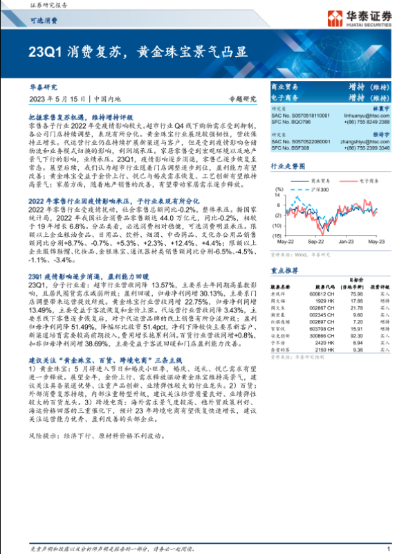 【华泰证券】【20230515】可选消费行业专题研究:23Q1消费复苏,黄金珠宝景气凸显-20页 行业研究