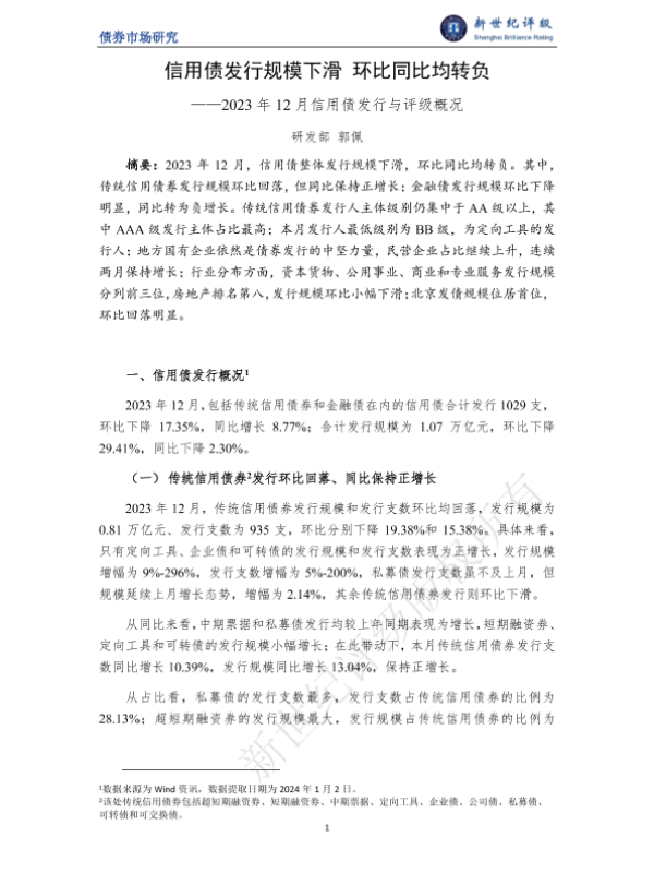 【研发部郭佩】【20240102】信用债发行规模下滑 环比同比均转负——2023年12月信用债发行与评级概况-7页 行业研究