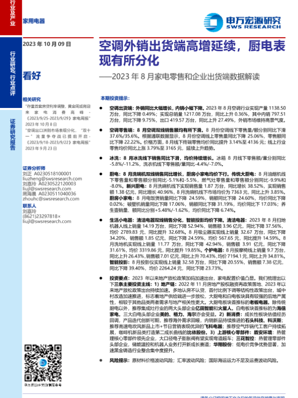 【申万宏源】【20231009】家用电器行业2023年8月家电零售和企业出货端数据解读:空调外销出货端高增延续,厨电表现有所分化-18页 行业研究