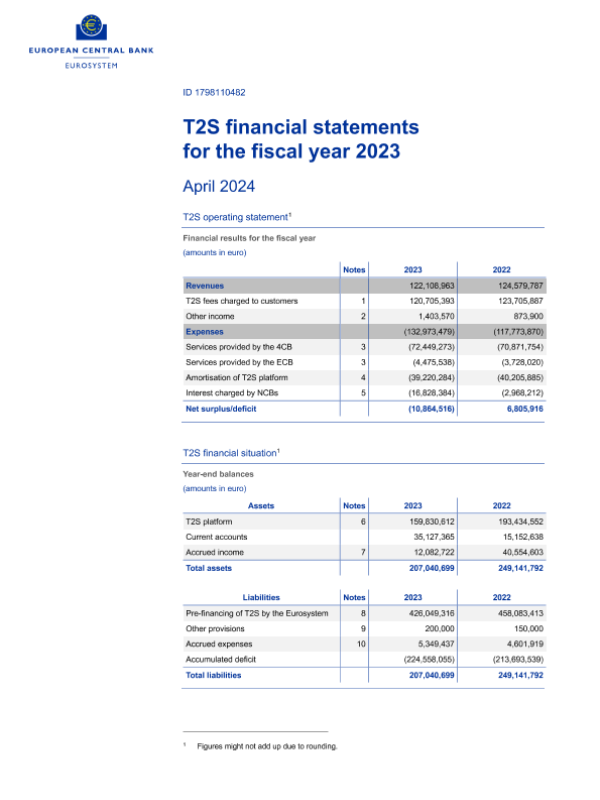 【European Central Bank】【20240401】欧洲央行-T2S 2023财年的财务报表-10页 行业研究