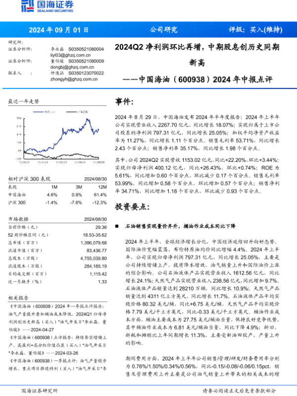 【国海证券】【20240901】中国海油(600938)2024年中报点评:2024Q2净利润环比再增,中期股息创历史同期新高-11页 行业研究