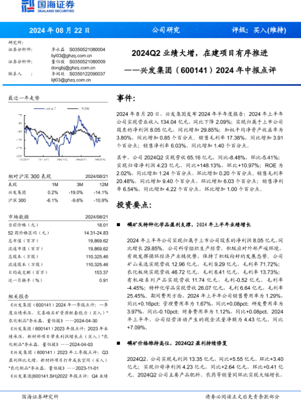 【国海证券】【20240822】兴发集团(600141)2024年中报点评:2024Q2业绩大增,在建项目有序推进-12页 行业研究