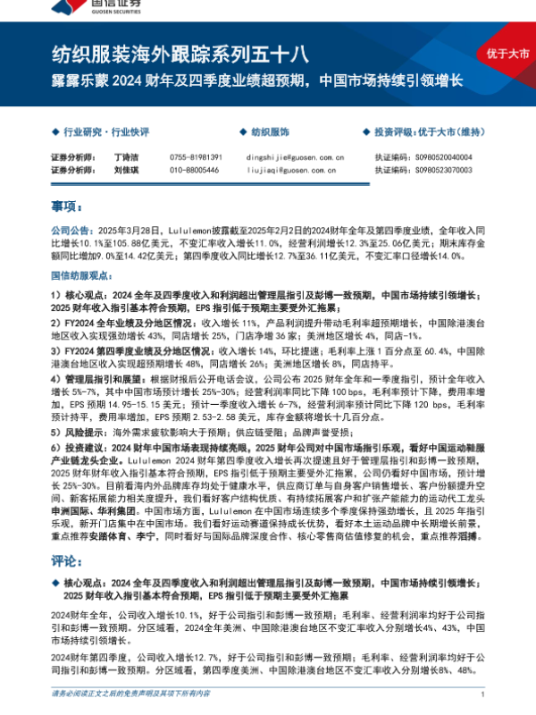 【国信证券】【20250403】纺织服装行业海外跟踪系列五十八:露露乐蒙2024财年及四季度业绩超预期,中国市场持续引领增长-11页 行业研究