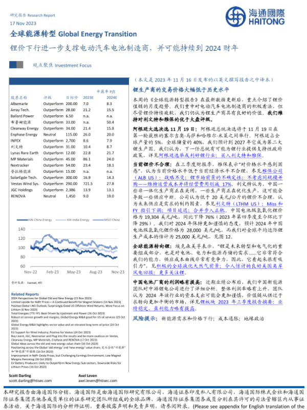 【海通国际】【20231117】全球能源转型:锂价下行进一步支撑电动汽车电池制造商,并可能持续到2024财年-17页 行业研究