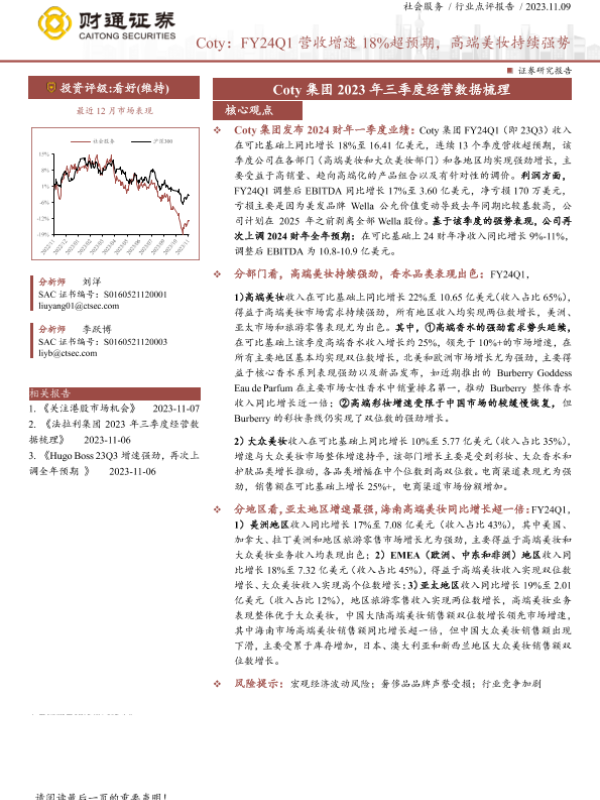 【财通证券】【20231109】Coty:FY24Q1营收增速18%超预期,高端美妆持续强势-2页 行业研究