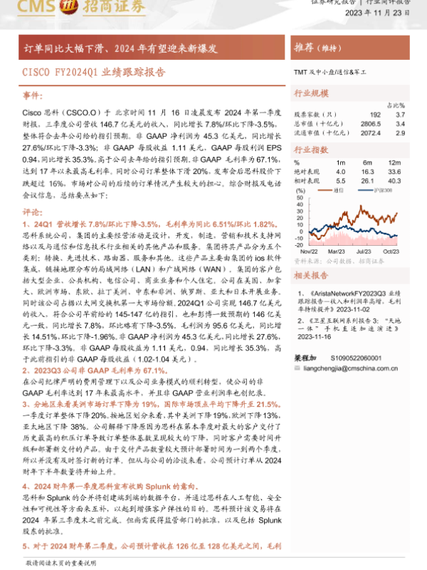 【海通证券】【20231123】20231123-招商证券-通信&军工CISCO FY2024Q1业绩跟踪报告:订单同比大幅下滑、2024年有望迎来新爆发-10页 财报
