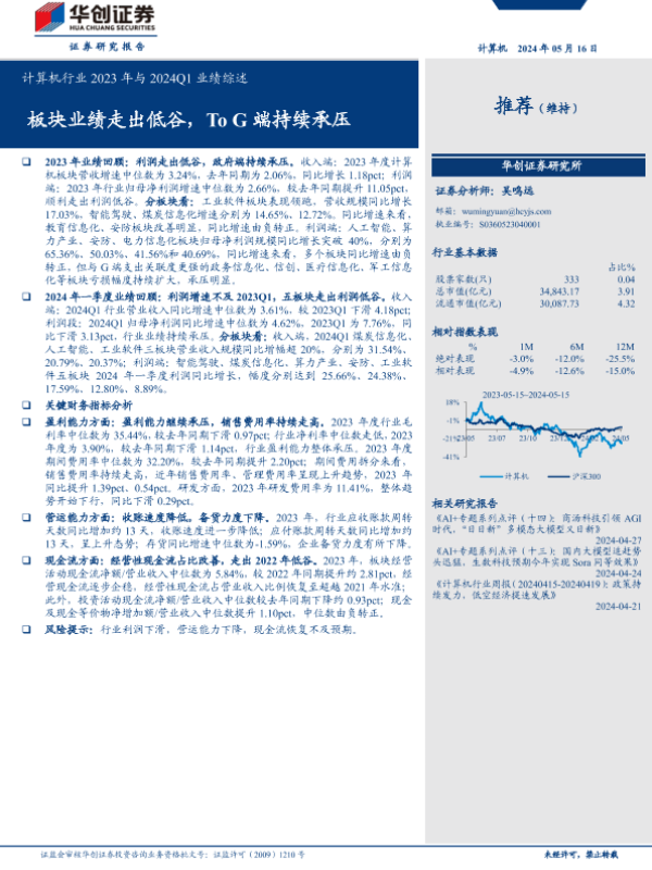 【华创证券】【20240516】计算机行业2023年与2024Q1业绩综述:板块业绩走出低谷,ToG端持续承压-15页 行业研究