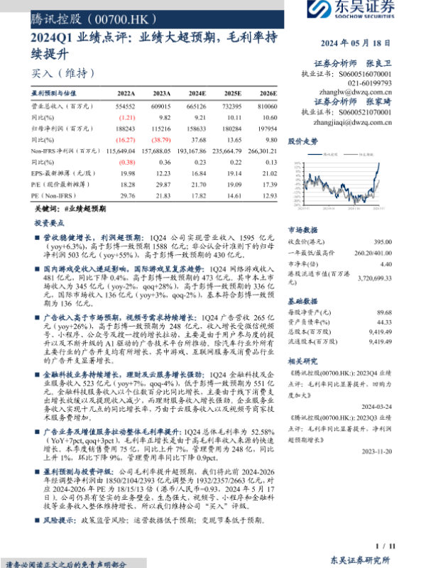 【东吴证券】【20240518】腾讯控股(00700.HK)2024Q1业绩点评:业绩大超预期,毛利率持续提升-11页 行业研究