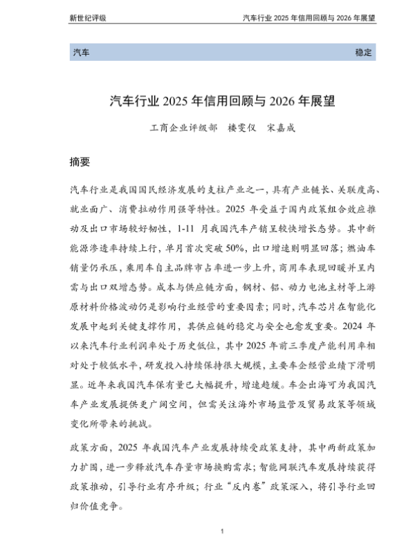 【新世纪评级】【2025】新世纪评级 汽车行业 2025年信用回顾与 2026年展望-56页 行业研究