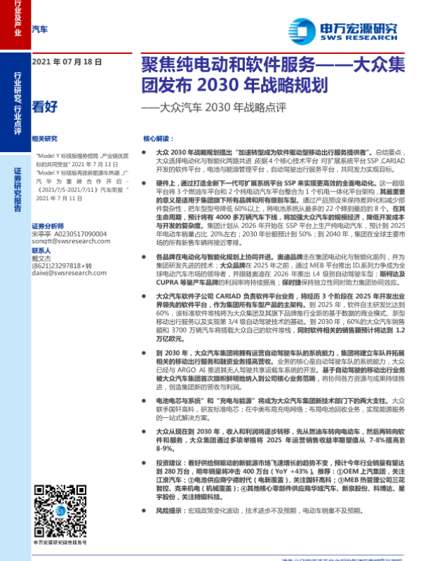 【申万宏源】【20210718】汽车行业大众汽车2030年战略点评:聚焦纯电动和软件服务-16页 行业研究