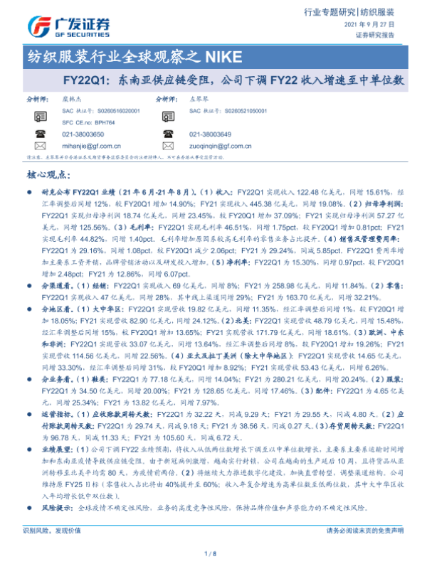 【广发证券】【20210927】纺织服装行业全球观察之 NIKE:FY22Q1:东南亚供应链受阻,公司下调 FY22收入增速至中单位数-8页 行业研究