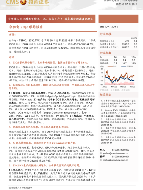 【海通证券】【20230720】台积电23Q2跟踪报告:全年收入同比增速下修至-10%,未来5年AI服务器处理器高速增长-12页 行业研究