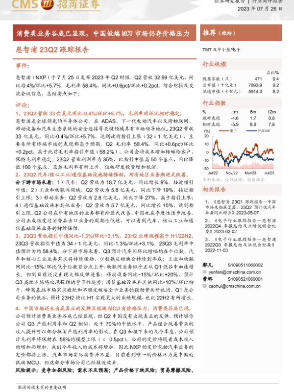 【海通证券】【20230726】20230726-招商证券-恩智浦23Q2跟踪报告:消费类业务谷底已显现,中国低端MCU市场仍存价格压力-12页 行业研究