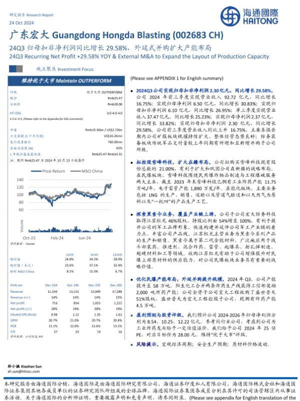 【海通国际】【20241024】广东宏大(002683)24Q3归母扣非净利润同比增长29.58%,外延式并购扩大产能布局-12页 行业研究