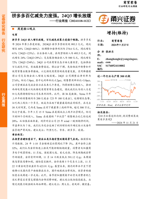 【甬兴证券】【20241127】商贸零售行业周报:拼多多百亿减免力度强,24Q3增长放缓-10页 行业研究