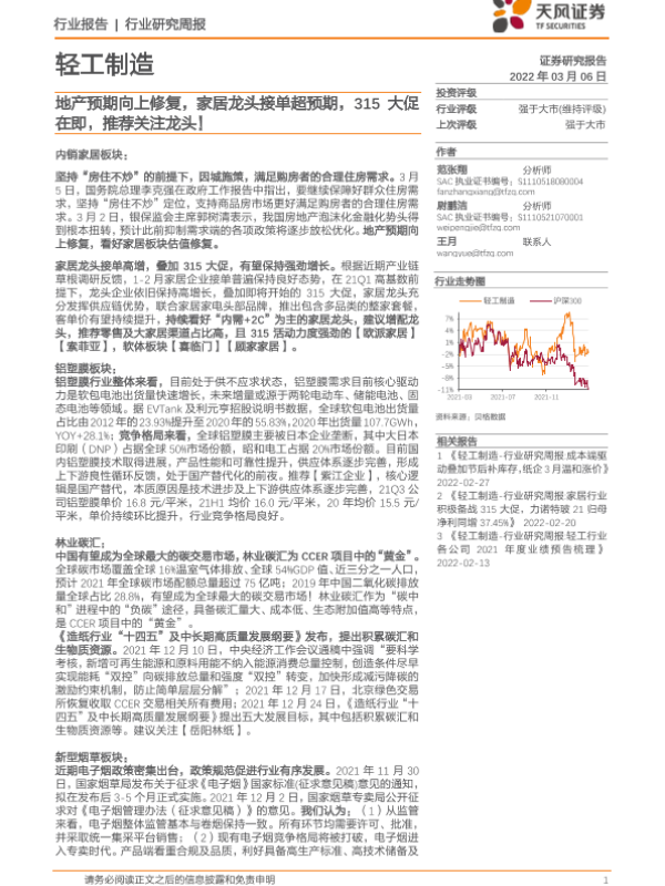 【天风证券】【20220306】轻工制造行业研究周报:地产预期向上修复,家居龙头接单超预期,315大促在即,推荐关注龙头!-25页 行业研究