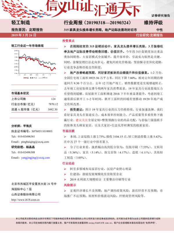 【山西证券】【20190324】20190324-山西证券-轻工制造行业周报:315家具龙头接单增长亮眼,地产边际改善利好后市-12页 行业研究