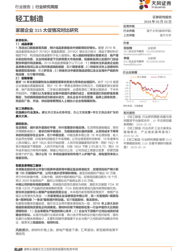 【天风证券】【20190303】轻工制造行业研究周报:家居企业315大促情况对比研究-28页 行业研究