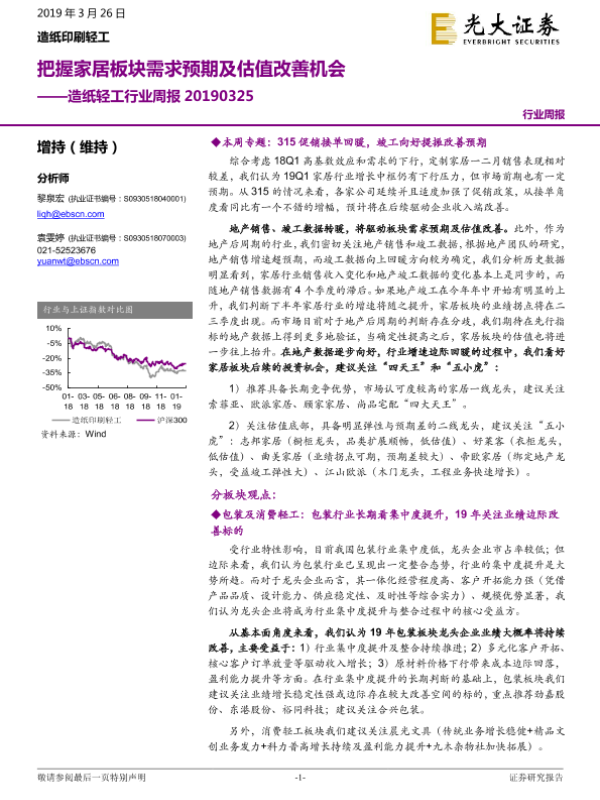 【光大证券】【20190326】20190326-光大证券-造纸轻工行业周报:把握家居板块需求预期及估值改善机会-22页 行业研究