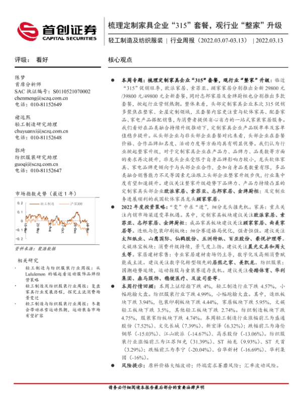 【首创证券】【20220313】20220313-首创证券-轻工制造及纺织服装行业周报:梳理定制家具企业“315”套餐,观行业“整家”升级-17页 行业研究