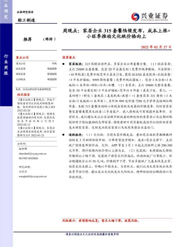【兴业证券】【20220227】20220227-兴业证券-轻工制造周观点:家居企业315套餐陆续发布,成本上涨+小旺季推动文化纸价格向上-22页 行业研究