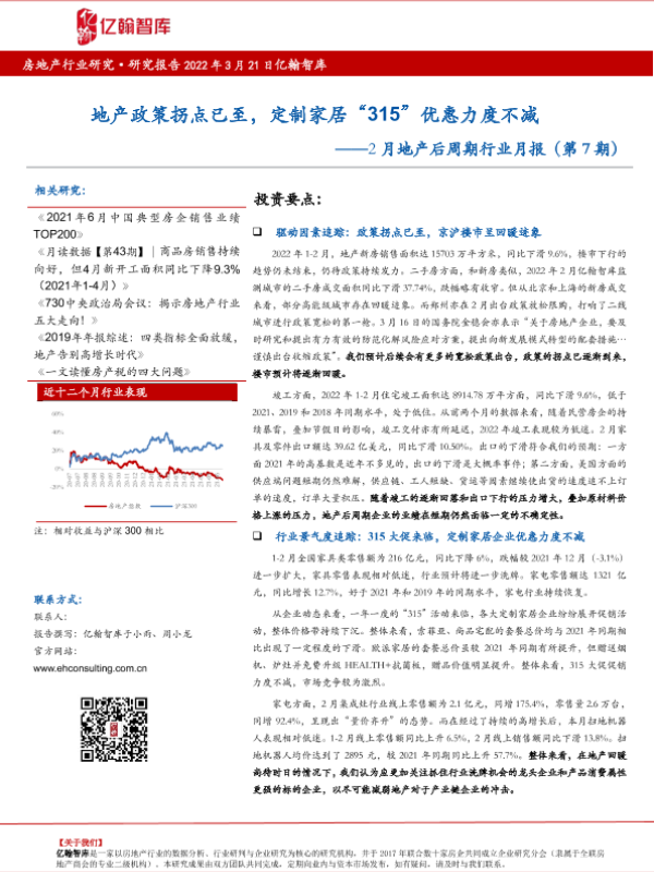 【亿翰智库】【20220321】2月地产后周期行业月报:地产政策拐点已至,定制家居“315”优惠力度不减-12页 行业研究