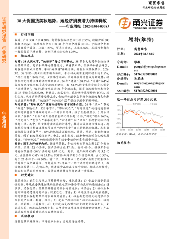 【甬兴证券】【20240313】商贸零售行业周报:38大促国货美妆起势,她经济消费潜力持续释放-12页 行业研究