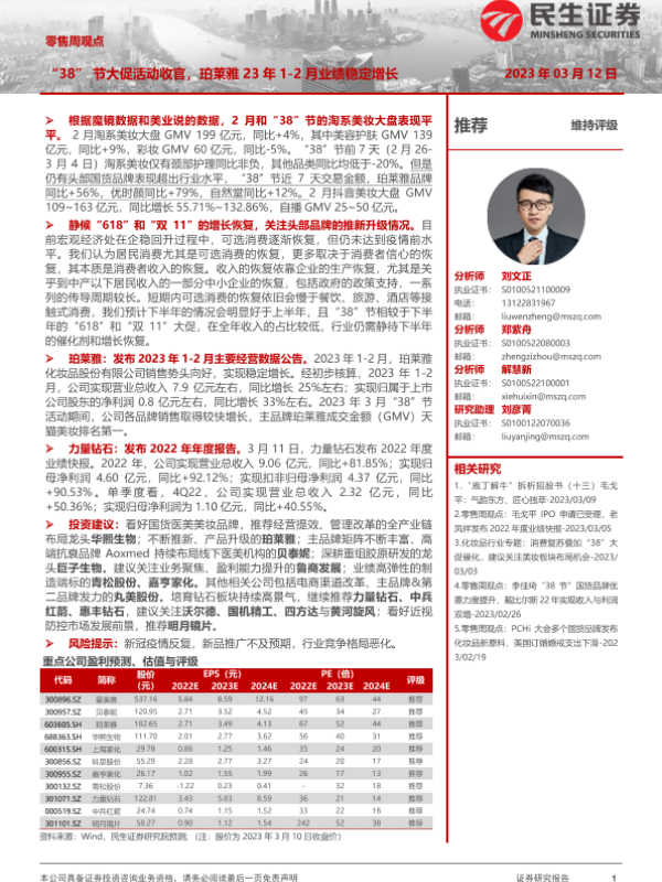 【民生证券】【20230312】零售周观点:“38”节大促活动收官,珀莱雅23年1-2月业绩稳定增长-19页 行业研究