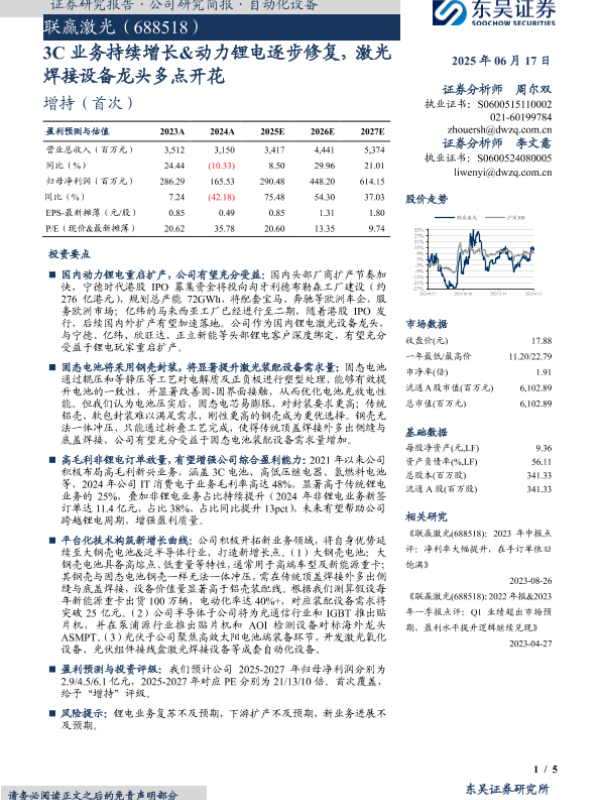 【东吴证券】【20250617】联赢激光:3C业务持续增长_动力锂电逐步修复_激光焊接设备龙头多点开花-5页 公司研究