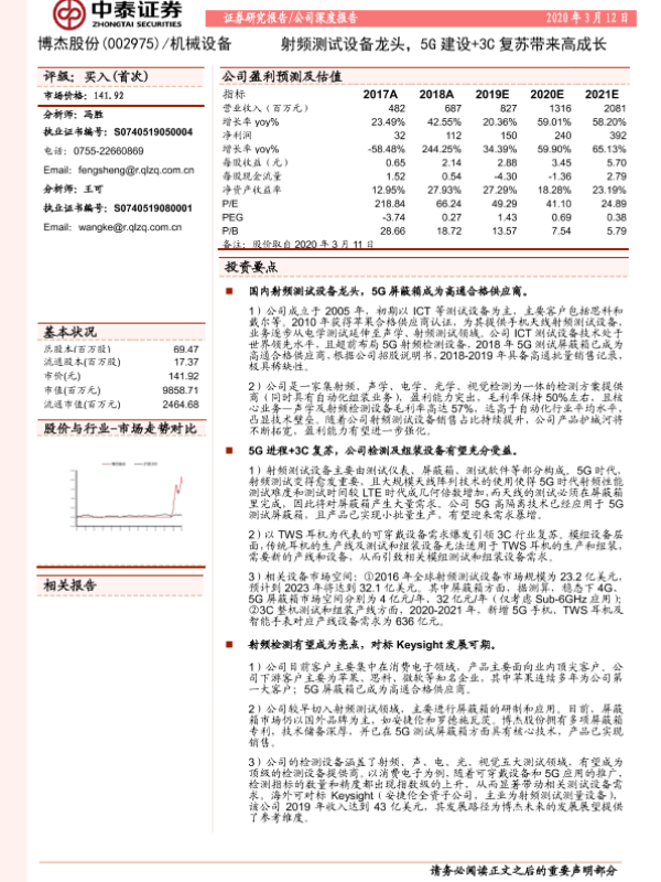 【中泰证券】【20200312】博杰股份-002975.SZ-射频测试设备龙头,5G建设+3C复苏带来高成长-34页 行业研究
