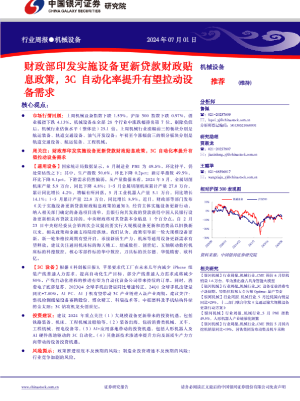 【银河证券】【20240701】20240701-中国银河-机械设备行业周报:财政部印发实施设备更新贷款财政贴息政策,3C自动化率提升有望拉动设备需求-11页 行业研究