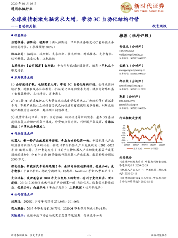 【新时代证券】【20200406】新时代证券-自动化周报:全球疫情刺激电脑需求大增,带动3C自动化结构行情-14页 行业研究