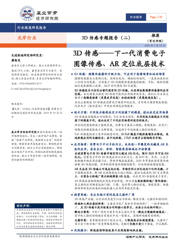 【基业常青经济研究院】【20200323】光学行业3D传感专题报告(二):3D传感,下一代消费电子图像传感、AR定位底层技术-21页 行业研究