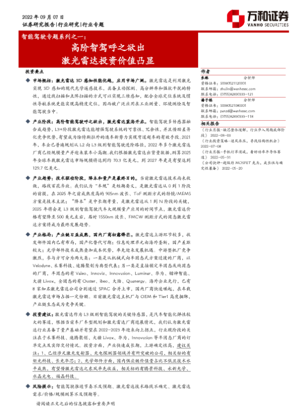 【万和证券】【20220907】智能驾驶专题系列之一:高阶智驾呼之欲出 激光雷达投资价值凸显-33页 行业研究