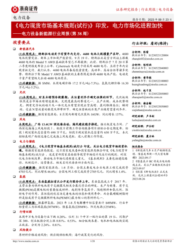 【浙商证券】【20230923】20230923-浙商证券-电力设备新能源行业周报(第38周):《电力现货市场基本规则(试行)》印发,电力市场化进程加快-28页 行业研究