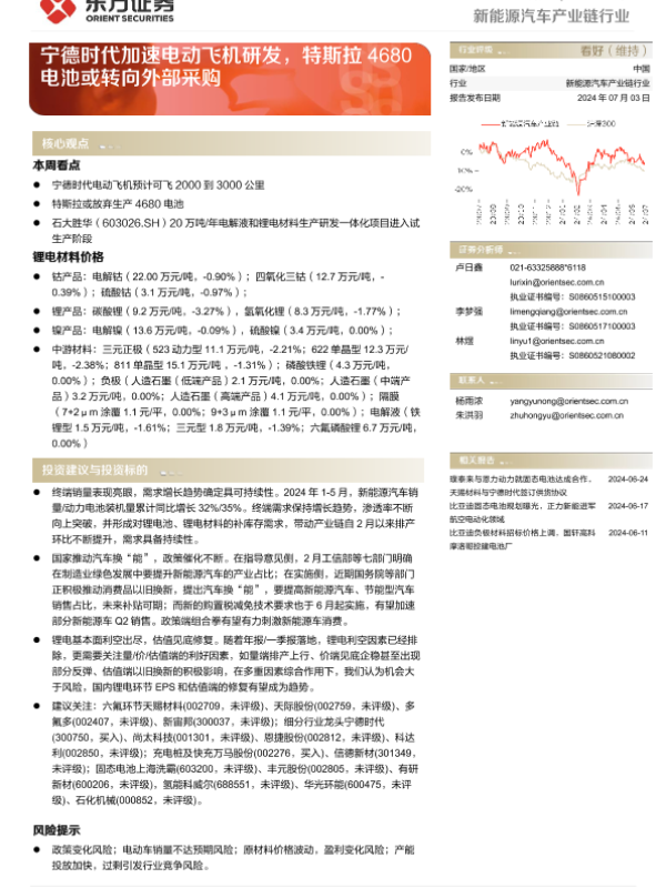 【东方证券】【20240703】新能源汽车产业链行业周报:宁德时代加速电动飞机研发,特斯拉4680电池或转向外部采购-13页 行业研究