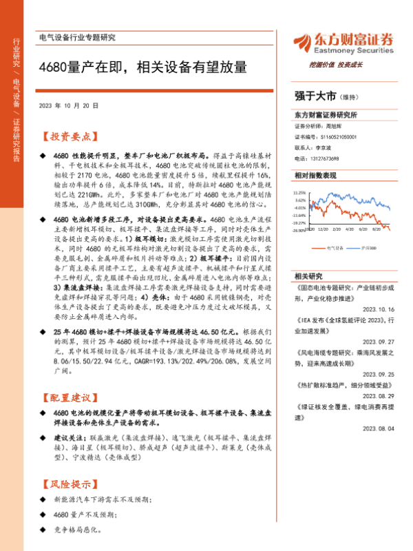 【东方财富证券】【20231020】电气设备行业专题研究:4680量产在即,相关设备有望放量-24页 行业研究
