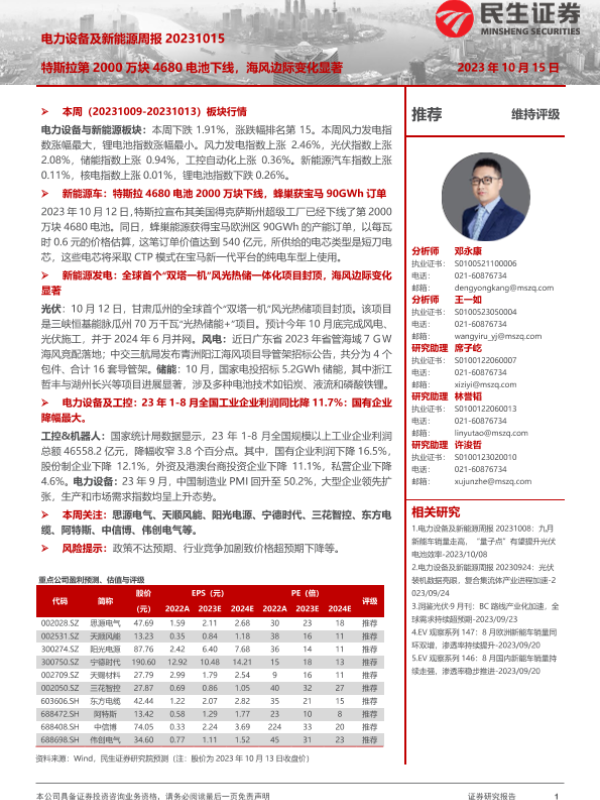 【民生证券】【20231015】电力设备及新能源周报:特斯拉第2000万块4680电池下线,海风边际变化显著-26页 行业研究