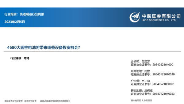 【中航证券】【20230205】20230205-中航证券-先进制造行业周报:4680大圆柱电池将带来哪些设备投资机会?-12页 行业研究