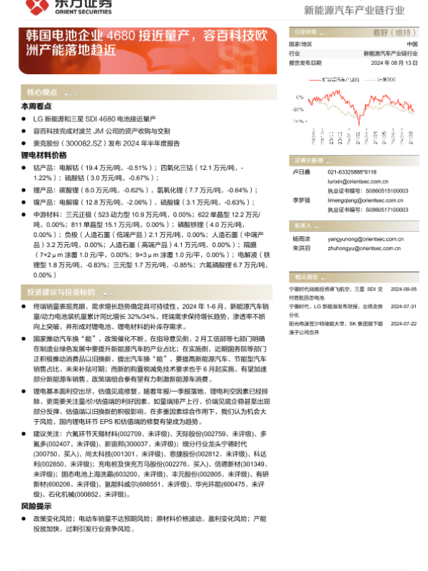 【东方证券】【20240813】20240813-东方证券-新能源汽车产业链行业周报:韩国电池企业4680接近量产,容百科技欧洲产能落地趋近-13页 行业研究