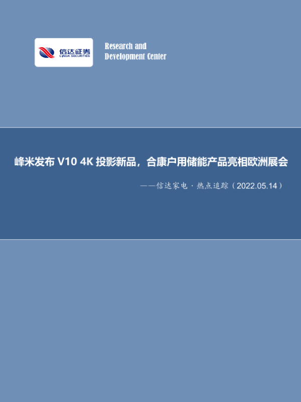 【信达证券】【20220514】信达家电·热点追踪:峰米发布V104K投影新品,合康户用储能产品亮相欧洲展会-12页 行业研究