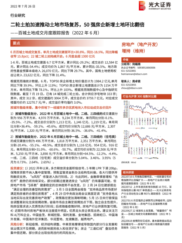 【光大证券】【20220726】房地产行业百城土地成交月度跟踪报告(2022年6月):二轮土拍加速推动土地市场复苏,50强房企新增土地环比翻倍-17页 行业研究