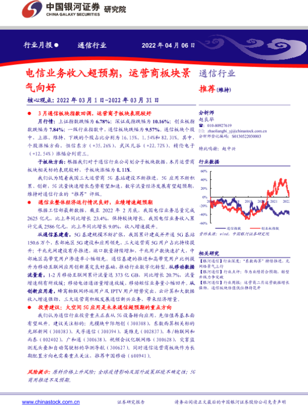 【银河证券】【20220406】通信行业月报:电信业务收入超预期,运营商板块景气向好-16页 行业研究
