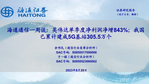 【海通证券】【20230829】海通通信一周谈:英伟达单季度净利润净增843%;我国已累计建成5G基站305.5万个-13页 行业研究
