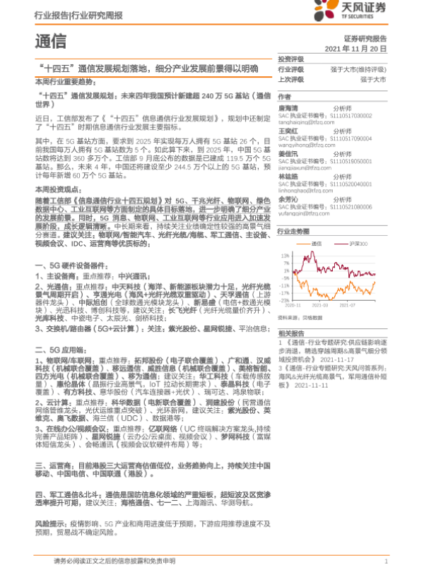 【天风证券】【20211120】20211120-天风证券-通信:“十四五”通信发展规划落地,细分产业发展前景得以明确-14页 行业研究
