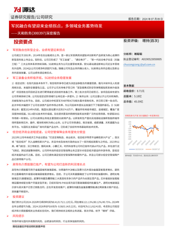 【源达信息】【20240709】天和防务-300397.SZ-深度报告:军民融合有望迎来业绩拐点,多领域业务蓄势待发-32页 行业研究