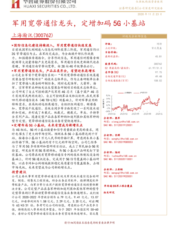 【华西证券】【20201123】军用宽带通信龙头,定增加码5G小基站-22页 行业研究